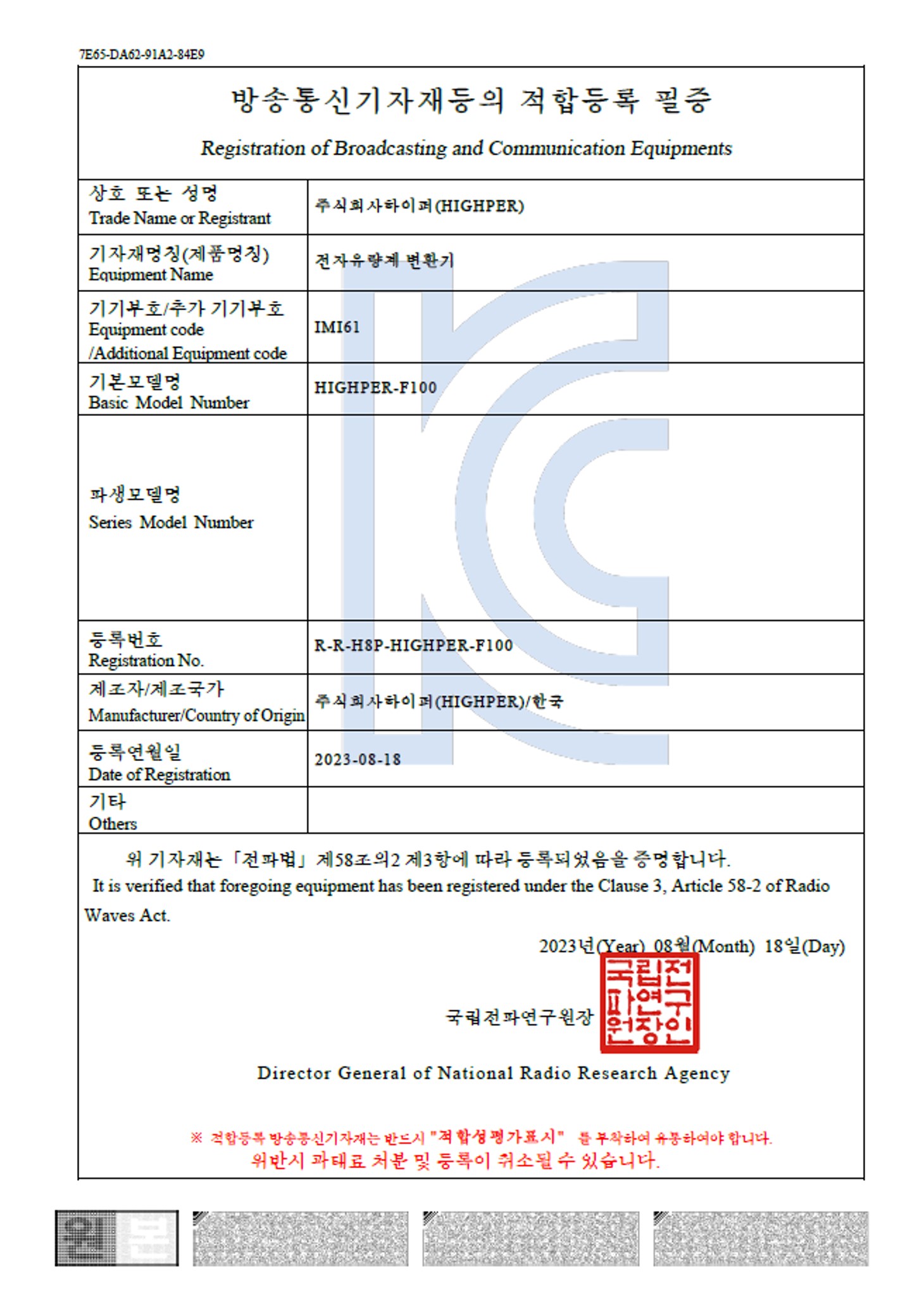 전자유량계 방송통신기자재등의 적합등록[HIGHPER-F100]